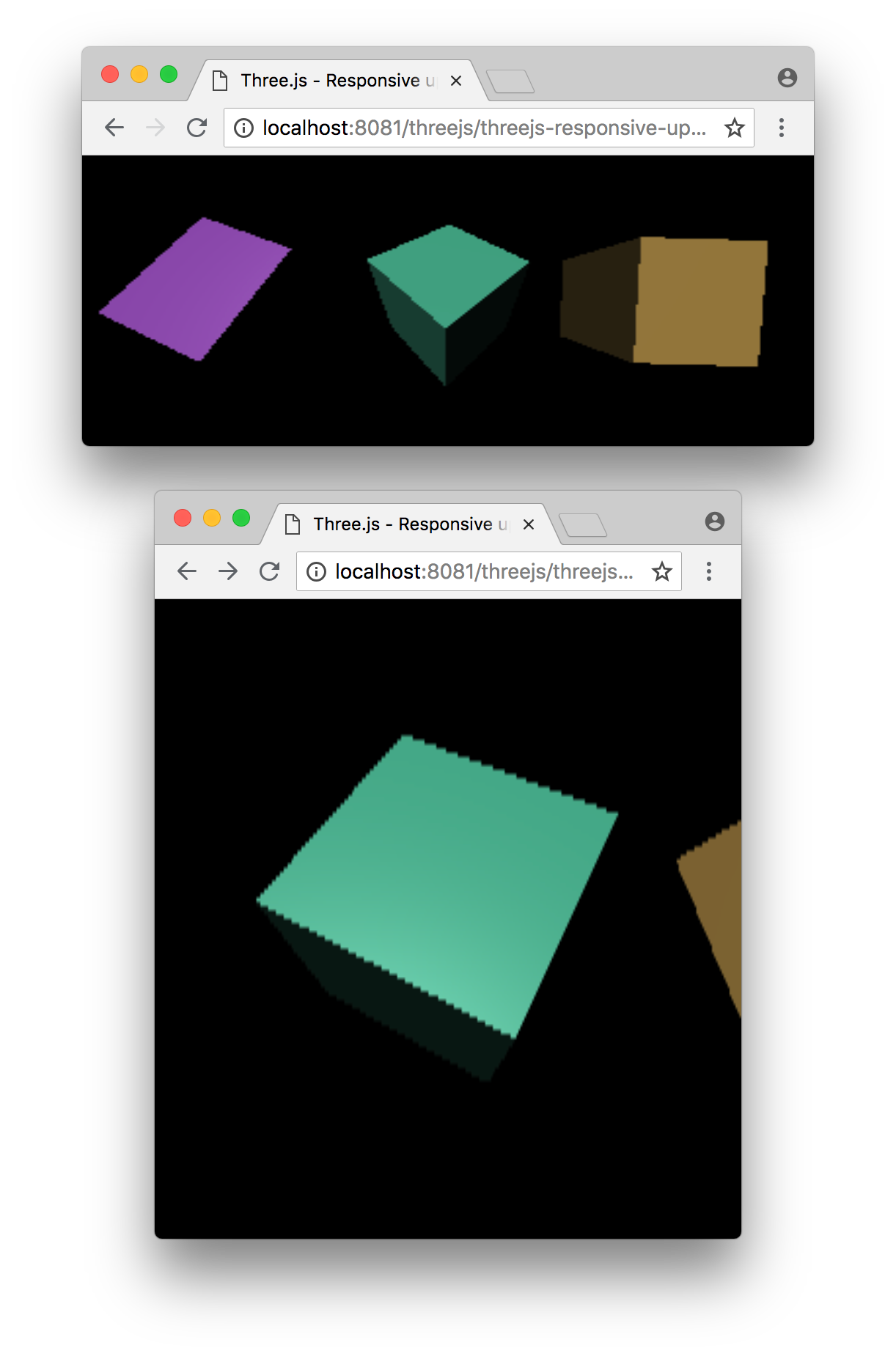在新标签页中打开例子你应该能看到立方体的宽高不会再被拉伸了。 他们都会保持正确的比例不管窗口的尺寸如何。