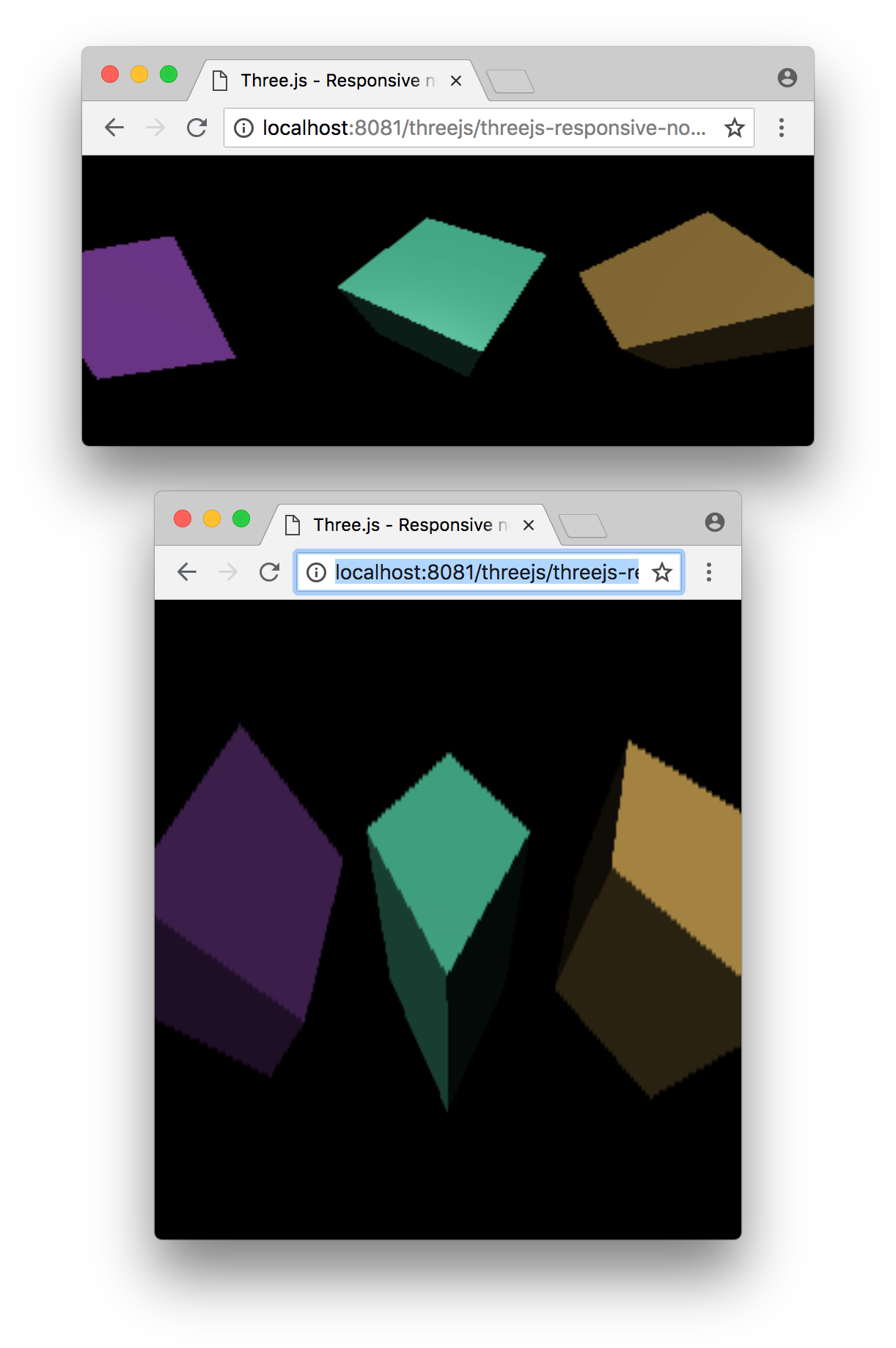 你可以看到canvas充满了整个页面,但是有两个问题。 第一是我们的立方体被拉伸了。他们不是立方体了更像是个盒子,太高或者太宽。 在新标签中打开它然后改变尺寸你就能看到立方体是怎么在宽高上被拉伸的。